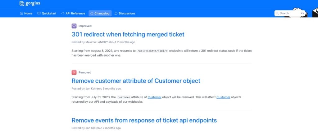 Gorgias‘ customer service platform has an easy-to-use changelog for tracking updates, fixes, and new features. Every entry includes a concise summary of the update or feature, any relevant links, and screenshots, so users can quickly learn how it impacts their experience.